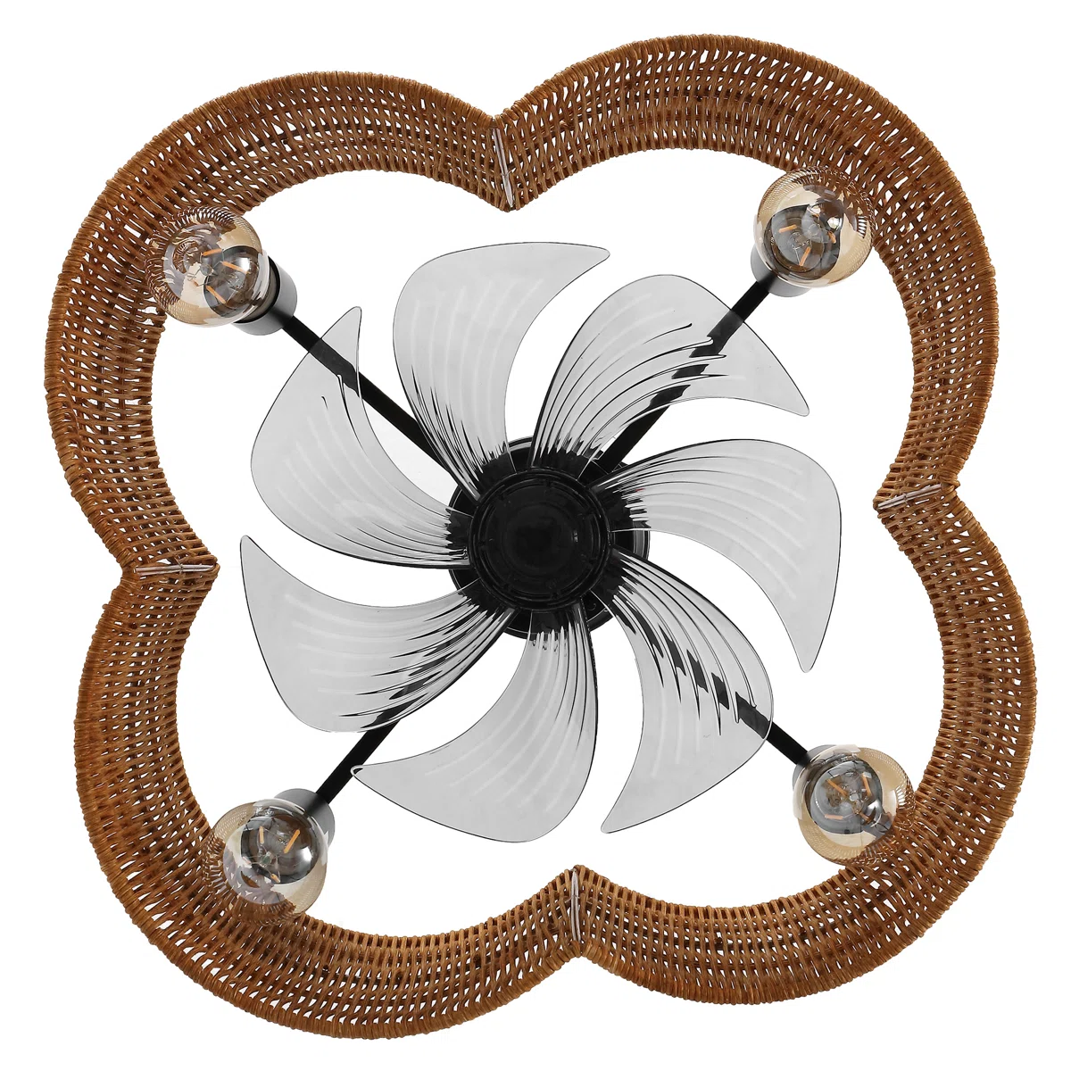 Elevate your space with the Black Rattan Fandelier with Light. This striking fixture combines a matte black metal frame with a meticulously hand-woven dark brown rattan shade. Its unique clover silhouette and rich earthy tones make it a perfect centerpiece for Modern Farmhouse or industrial-themed interiors.