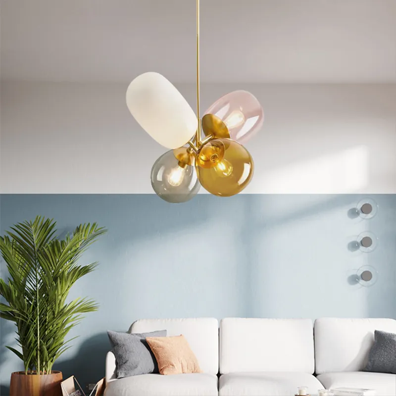 The standout feature of this Mid-Century Modern Colorful Glass Pendant Light is its collection of multi-color glass shades. Ranging from amber and smoke gray to soft pink and milky white, these “pebble” shapes offer a playful yet sophisticated aesthetic. This Contemporary Art Glass design is ideal for adding a pop of color to a minimalist kitchen island or a chic living room corner.