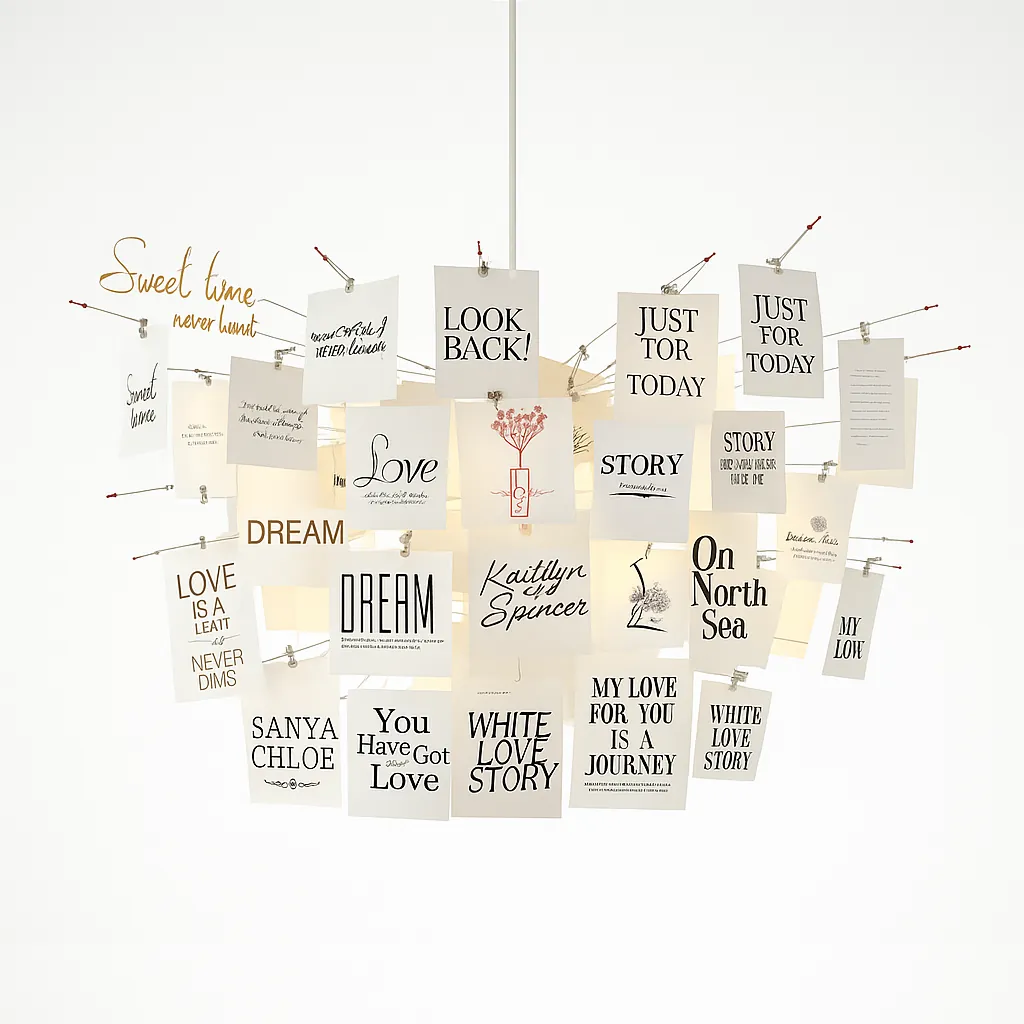 Our DIY photo note chandelier comes with a set of pre-designed artistic patterns to get you started. But the real magic happens when you use the included blank camera papers. You can print your favorite moments or write handwritten notes to create a lighting fixture that is 100% unique to you.