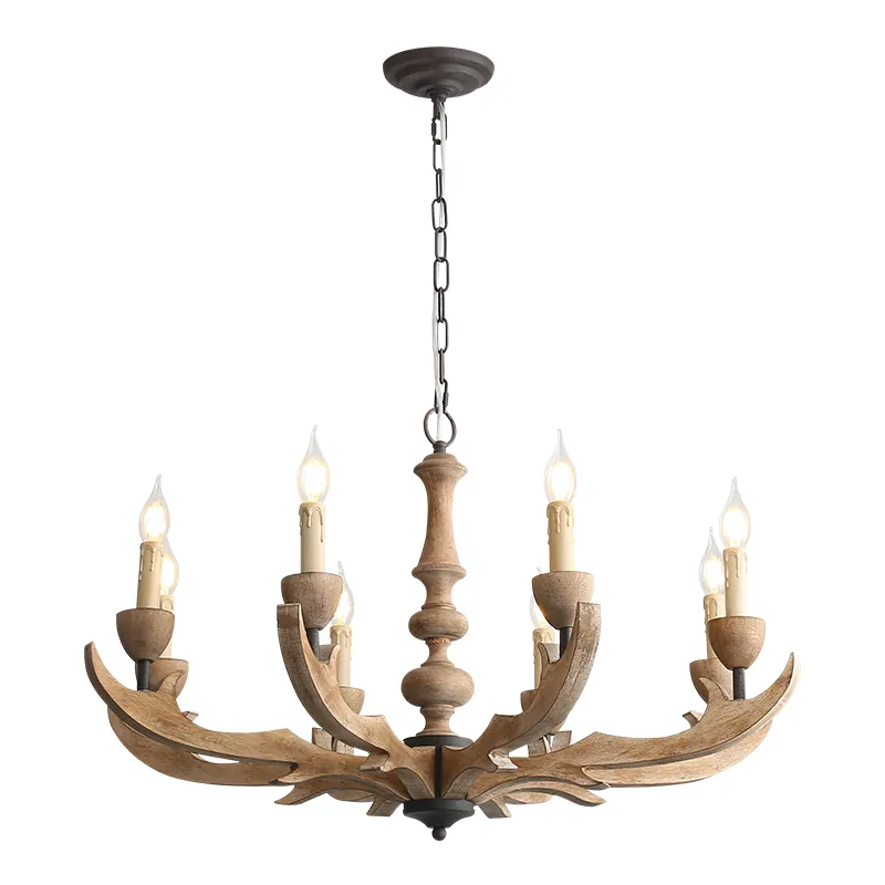 The soul of this chandelier lies in its central column. Unlike mass-produced plastic alternatives, our pillar is made from solid wood, featuring intricate hand-carved details. The distressed finish provides an aged, “found-it-in-a-French-chateau” look that complements both farmhouse and traditional interiors.