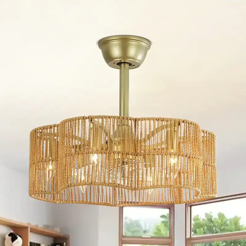We understand that every ceiling height is different. That’s why each Gold Rattan Fandelier with Remote comes with two distinct downrods. You can choose the shorter rod for lower ceilings to maintain a flush-mount look, or the longer rod for high-vaulted living rooms to ensure optimal air circulation. The enclosed “caged” design also makes it a safer choice for nurseries and bedrooms with bunk beds compared to traditional exposed-blade fans.