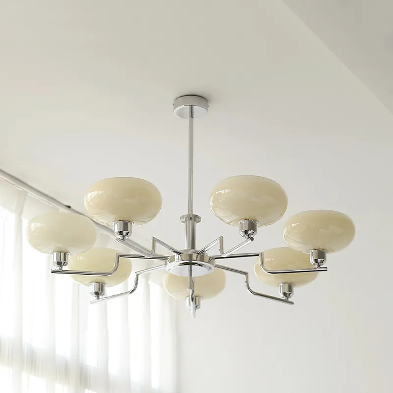 Available in 3, 5, or 7-light layouts, this fixture allows you to customize the intensity of your space. The sleek metal arms extend to hold translucent glass shades that seem to float in mid-air, a signature look of the Bauhaus and Space Age eras.