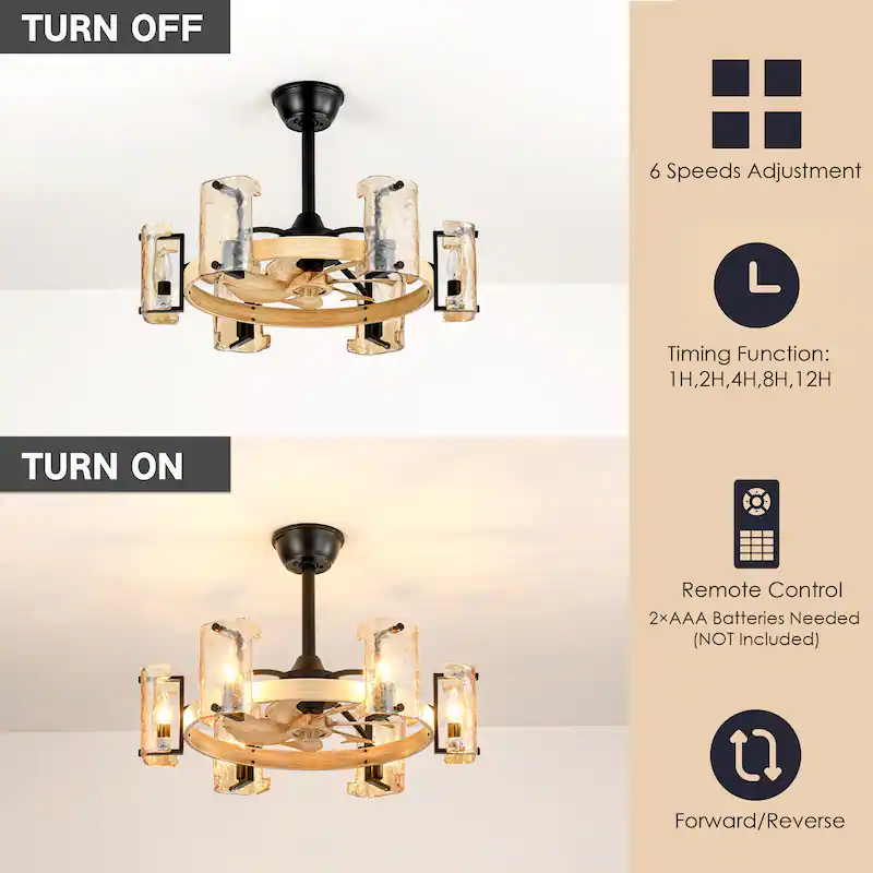 Experience the perfect blend of modern rustic charm and functional cooling. This artisanal fandelier features a hand-applied wood grain finish on a durable metal frame, paired with sophisticated water-ripple glass to provide both a refreshing breeze and warm, ambient illumination.